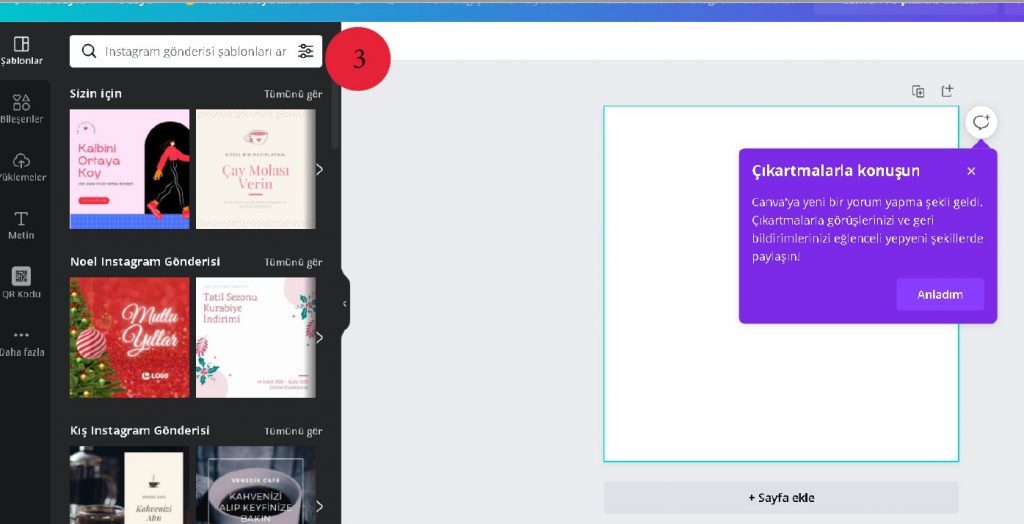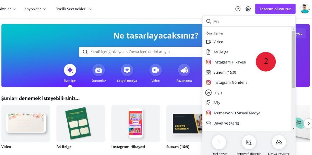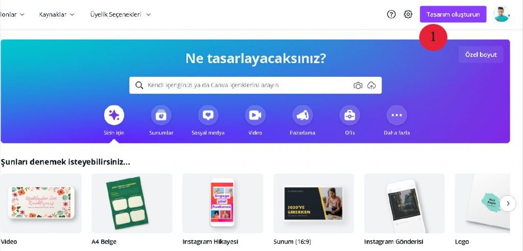3. Canva Hesabınıza giriş yaptıktan sonra ana sayfada sağ üstte bulunan ”Tasarım Oluşturun” bölümüne tıklayınız.